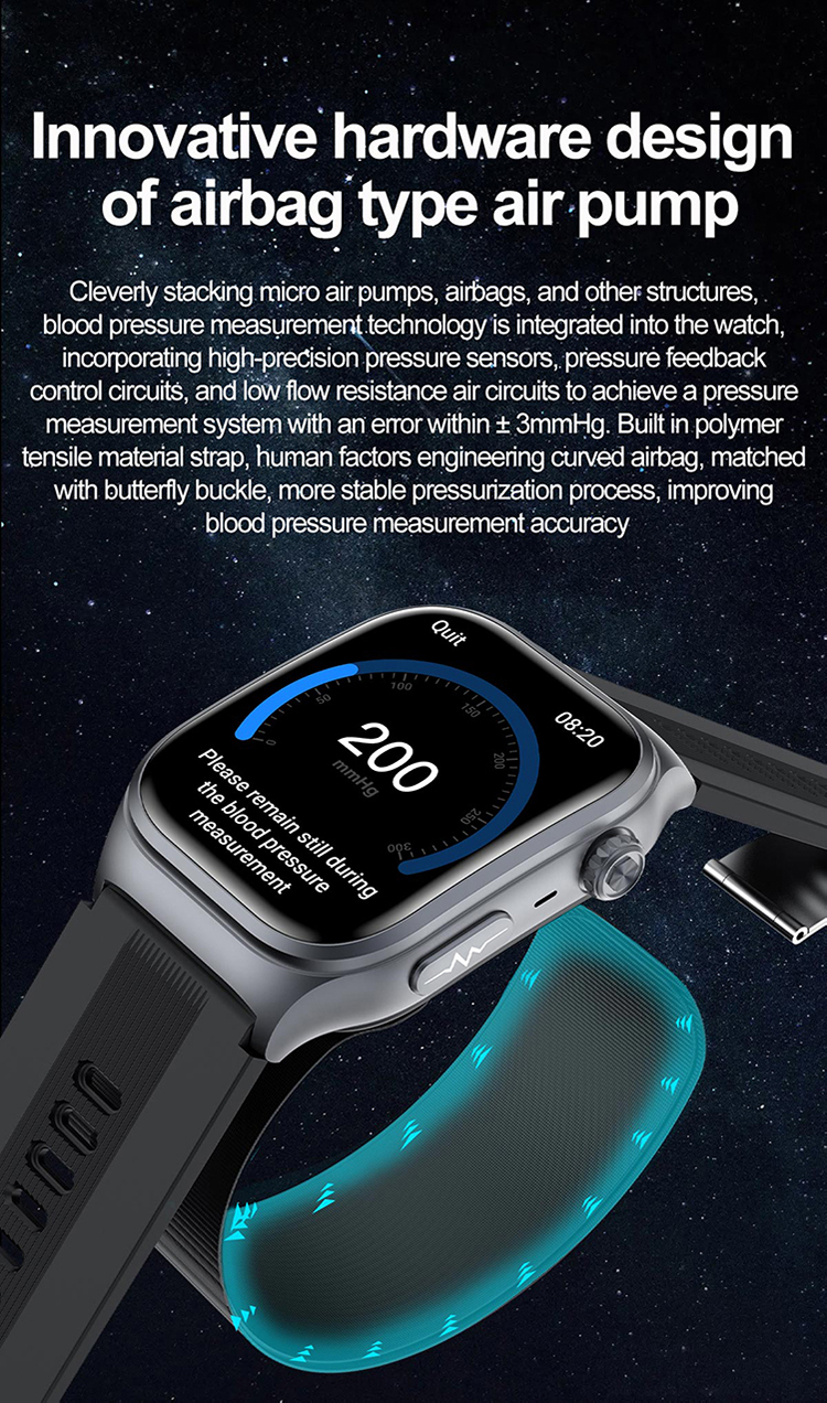 Main Feature:Air pump+balloon true blood pressure test, body temperature monitoring, blood oxygen monitoring, respiration rate. Sleep monitoring, sedentary reminder and other health management functions.